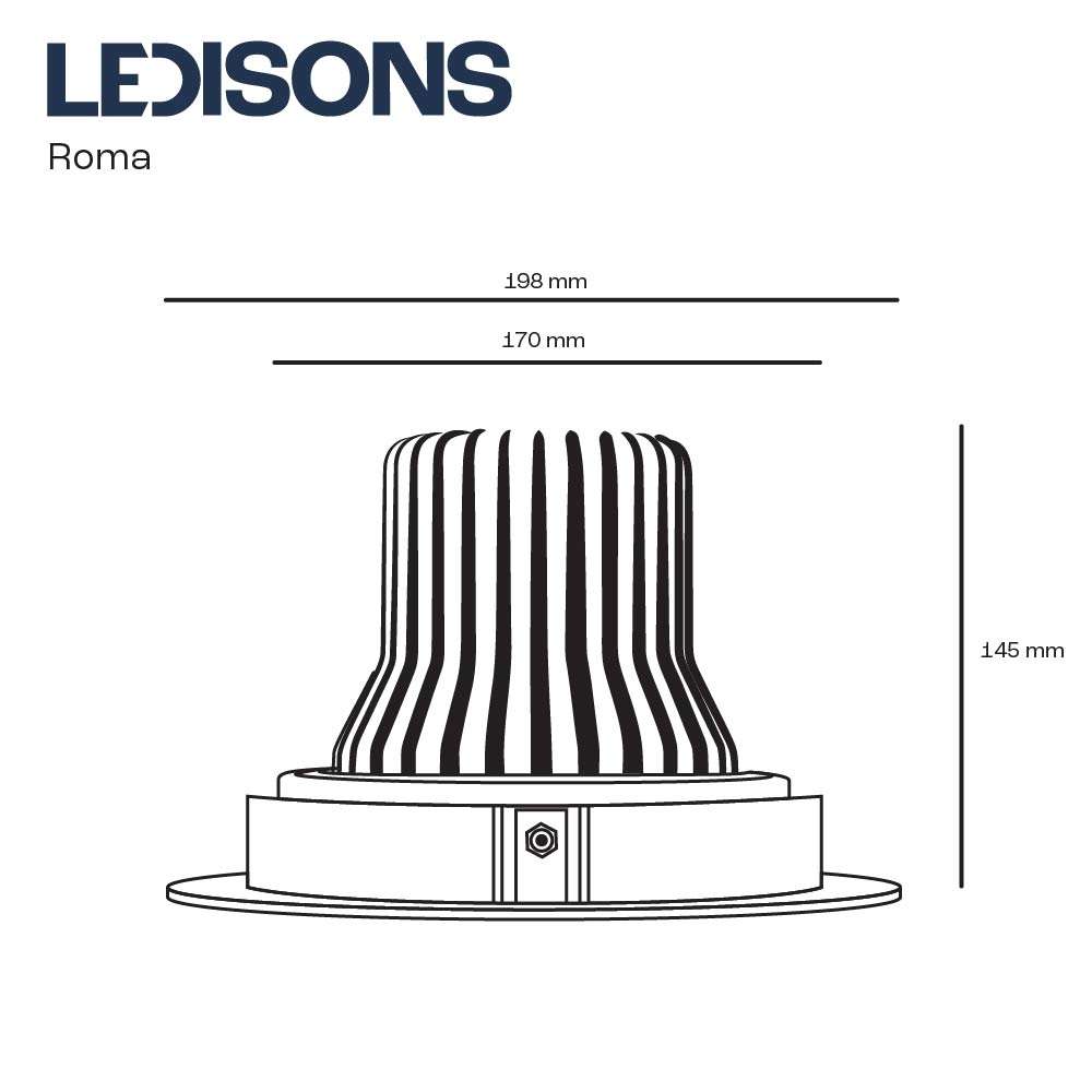Ce downlight est parfait pour l’éclairage des magasins, des musées, des restaurants et d’autres lieux où il est important d’avoir un bon éclairage et une grande stabilité des couleurs. En raison de sa conception et parce que le faisceau lumineux de ce downlight LED n’est que de 60 degrés, cette lampe présente un très faible éblouissement de UGR <16. De ce fait, le downlight LED n’éblouira pas les yeux de vos visiteurs. Le spot downlight peut être parfaitement intégré dans le faux plafond et y affiche une belle place avec son beau design. La découpe pour le downlight est de 170 mm. Comme le bord extérieur du downlight à LED est de 198 mm, il s’adapte bien au-dessus du trou de scie.