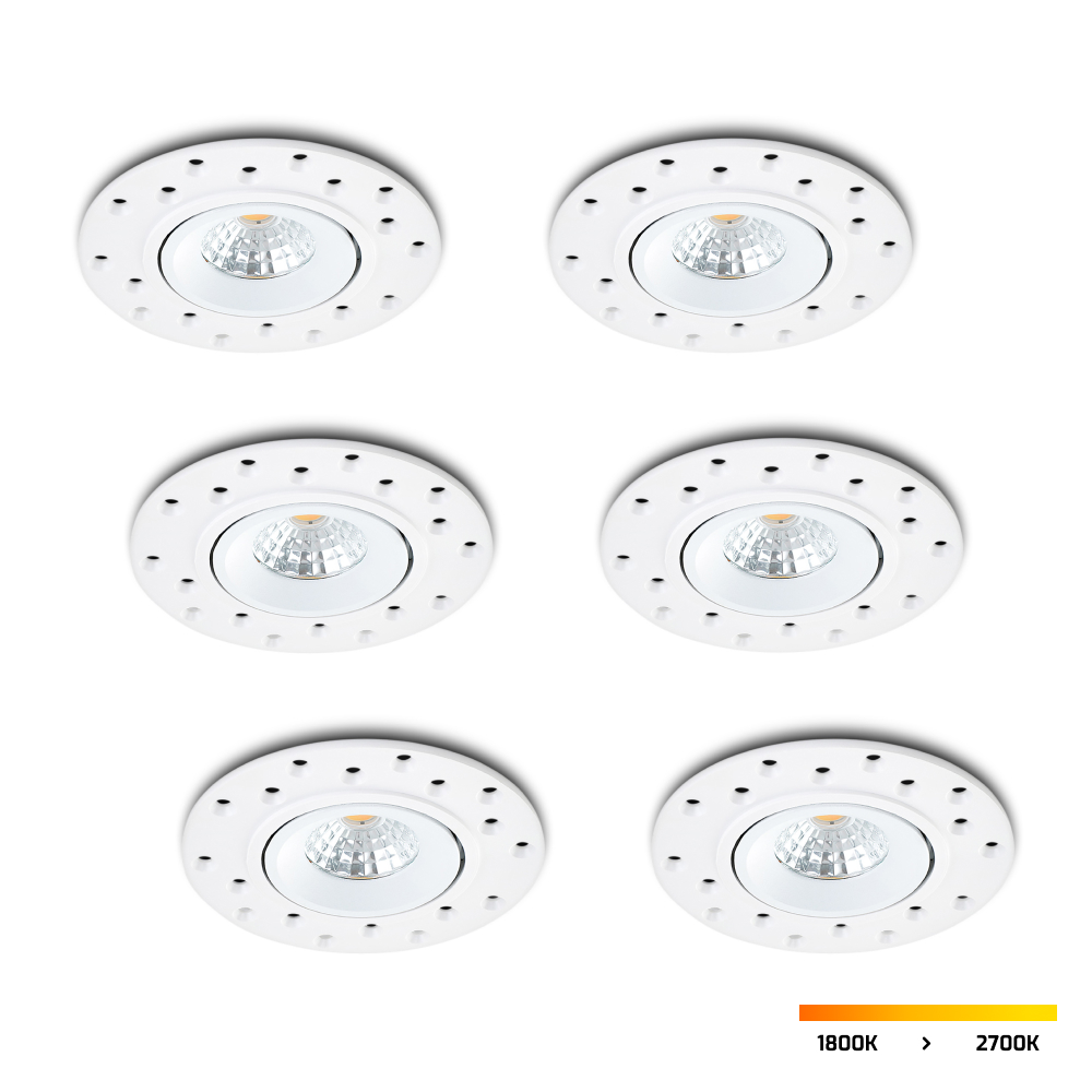 Les spots sans cadre peuvent être complètement atténués dans leur intensité, sans bourdonnement. Le réglage de l’intensité est continu, ce qui procure un effet très appréciable. Les spots dimmables sans cadre sont dimmables à l’aide d’un variateur à coupure de phase. Les spots Dim-to-Warm peivent varient non seulement en intensité, mais aussi en dans la couleur de leur lumière. Lorsque les spots sont allumés à pleine intensité, la couleur de leur lumière est de 2700 K. Avec le variateur d’intensité, la couleur de la lampe devient plus chaude ; au niveau de variation le plus élevé, la lampe affiche une couleur d’environ 1800 K. Les spots ont une très belle restitution des couleurs, c’est-à-dire un excellent rendu des couleurs. De ce fait, ces spot sans cadre conviennent également à une utilisation dans les magasins et les salles d’exposition, où le rendu des couleurs est un élément essentiel.